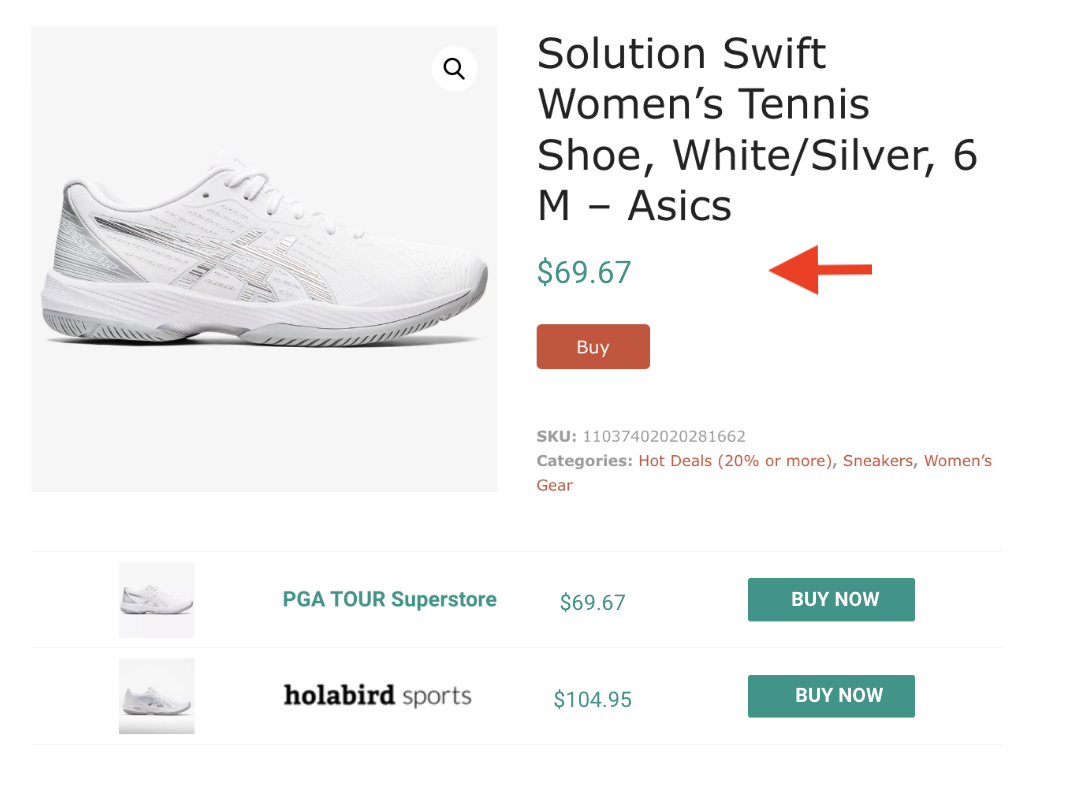 This means, the price of the product at the selected merchant for the WooCommerce product will be displayed. In this case, the selected merchant is PGA Tour Superstore.