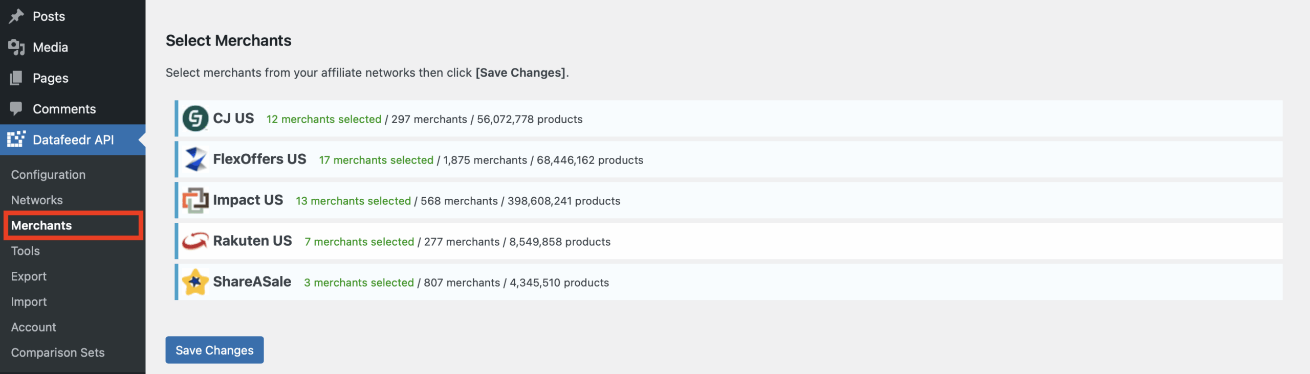 Once your affiliate networks are added to your Datafeedr account, you can link directly to the specific merchants you partner with on each of these networks.